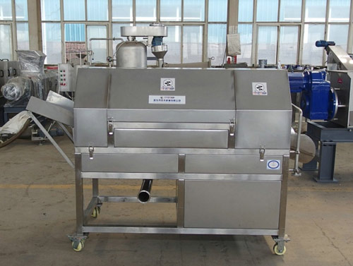 該轉(zhuǎn)篩為內(nèi)篩式過濾,通過篩網(wǎng)上焊接的內(nèi)螺旋不停的轉(zhuǎn)動(dòng),逐漸把脫水后的固形物推出去,過濾后的清液經(jīng)轉(zhuǎn)篩外的不銹鋼腔體收集后從管路排出,從而達(dá)到固液分離的目的。